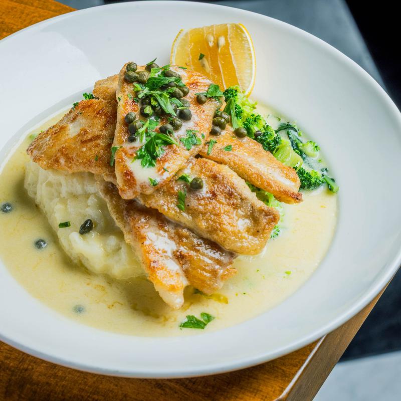 Garlic mashed potatoes, spinach, lemon–caper butter sauce