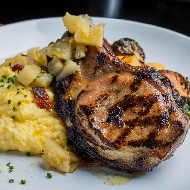 Wood-fired | Creamy polenta, Brussels, bacon, and pear chutney