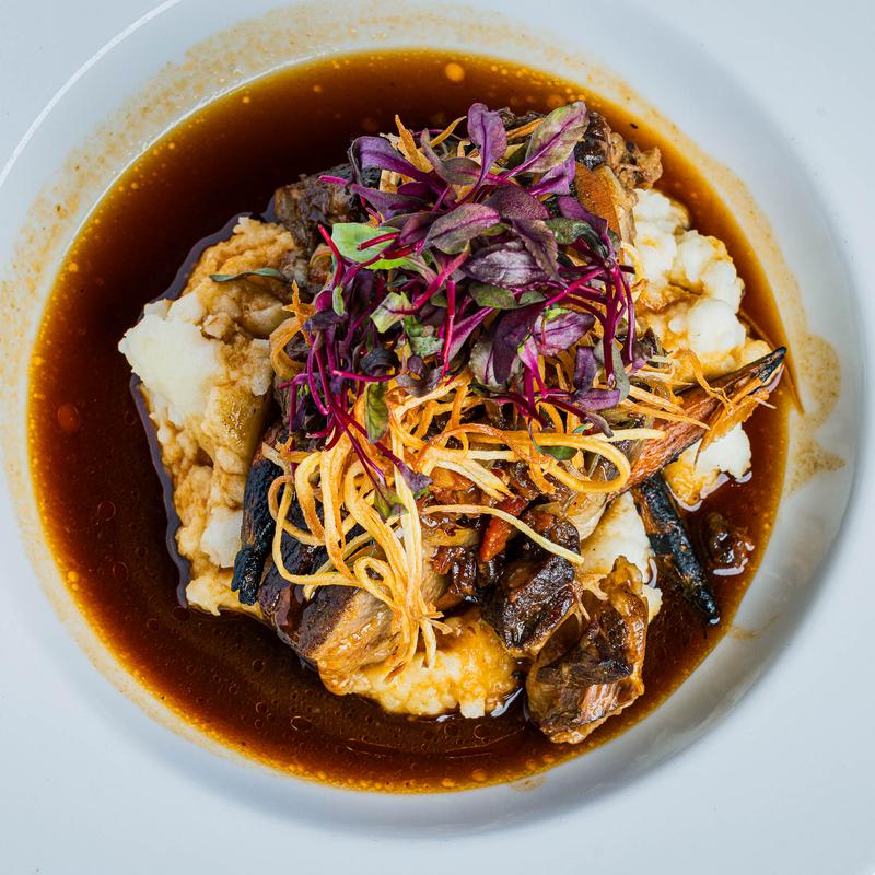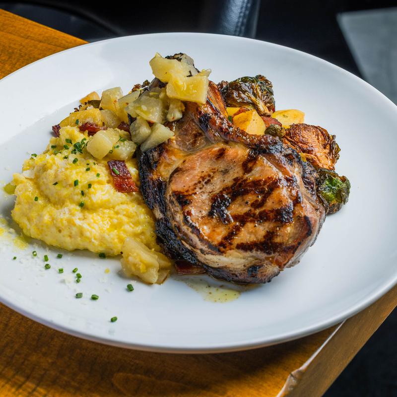 Wood-fired | Creamy Polenta, Brussels, Bacon, and Apple Chutney