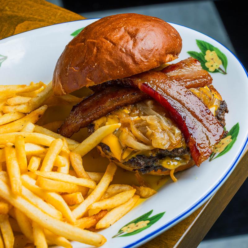 2 slices of American, Billionaire’s Bacon, Caramelized Onions, Dijonnaise