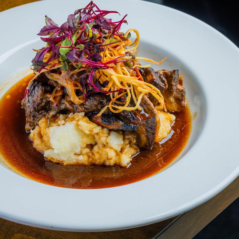 Roasted garlic mashed potatoes, rainbow carrots, bacon onion marmalade, crispy parsnips