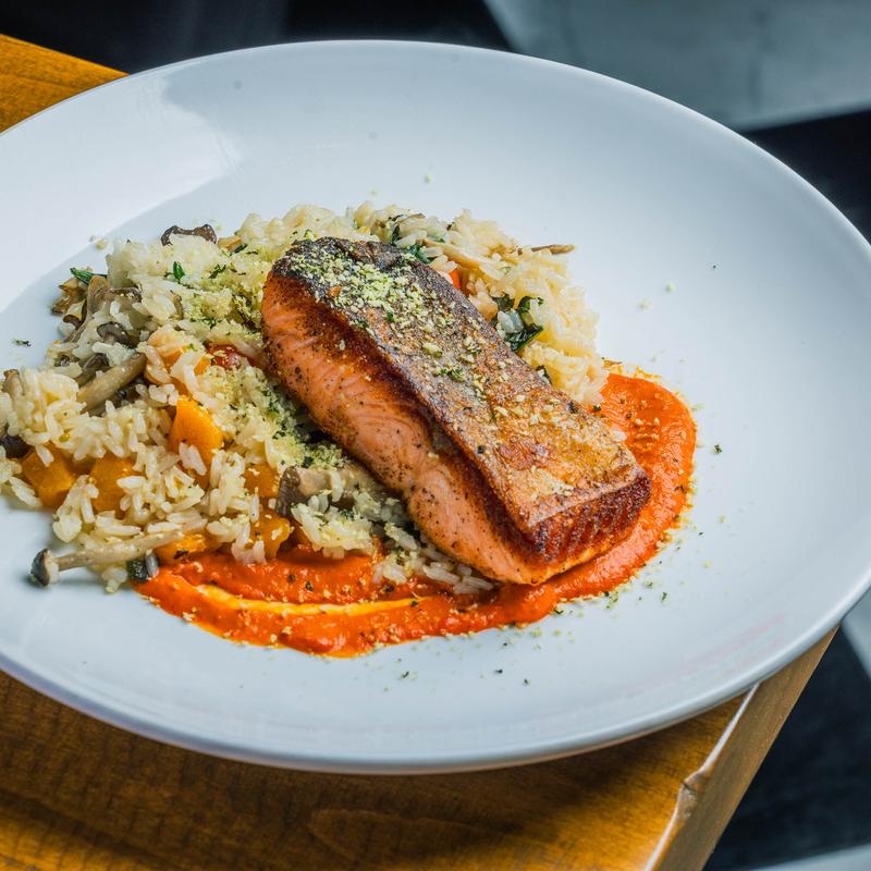 Jasmin rice, mushroom, spinach, cherry tomato, butternut squash, roasted bell pepper cream, and herb crumble