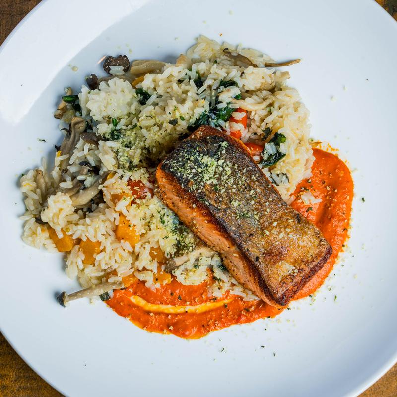 Garlic Mashed Potatoes, Roasted Rainbow Cauliflower, Spinach, Butternut Squash, Onion, Currants, Almonds, Salsa Verde