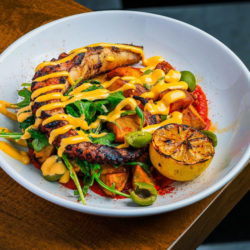 Roasted Potatoes, Romesco Sauce, Olives, Calabrian Chili Aioli, Paprika